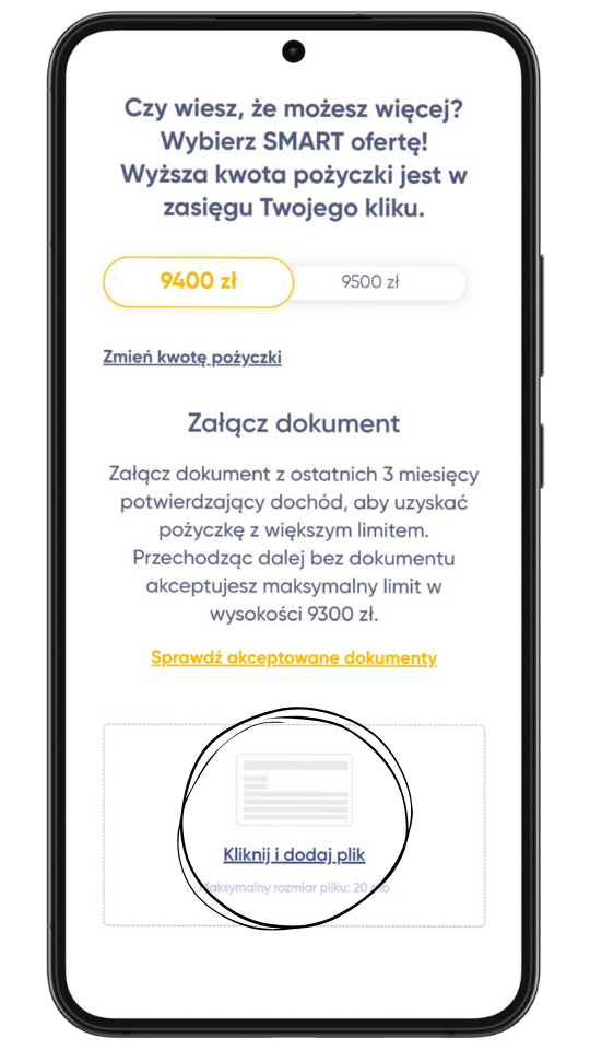 UWAGA! Dokumenty potwierdzające wysokość Twoich dochodów możesz załączyć jeszcze przed złożeniem wniosku o pożyczkę w wyższej kwocie, dzięki czemu w przyszłości proces aplikacji przebiegnie sprawniej. Możesz to zrobić logując się do swojego profilu w strefie klienta i wchodząc w zakładkę “Dane osobowe”. Dodanie dokumentu jest bardzo proste zarówno na telefonie, jak i na komputerze.